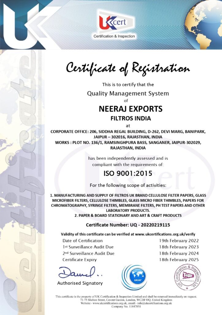 FILTROS INDIA is certified according to ISO 9001:2015.